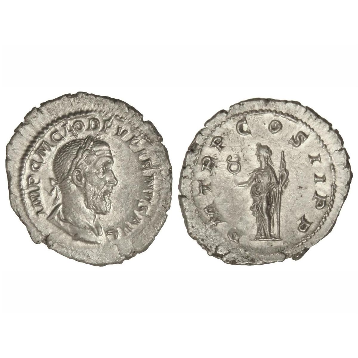 Denario. - Acuñada el 238 d.C. - PUPIENO. - Anv.: IMP. C. M. CLOD. PVPIENVS AVG. Busto laureado a derecha. Rev.: P. M. TR. P. COS. II P. P. Felicidad en pie de frente. 3,03 grs. C-26. EBC+. - -
