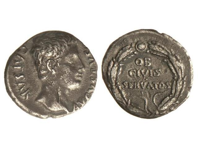 Denario. Acuñada el 25-22 a.C. AUGUSTO. Anv.: CAESAR AVGVSTVS. Cabeza a derecha. Rev.: OB CIVIS SERVATOS en tres líneas, dentro de corona de roble. 3,837 grs. Pátina. (Golpe de cizalla en anverso). C-210. MBC+.