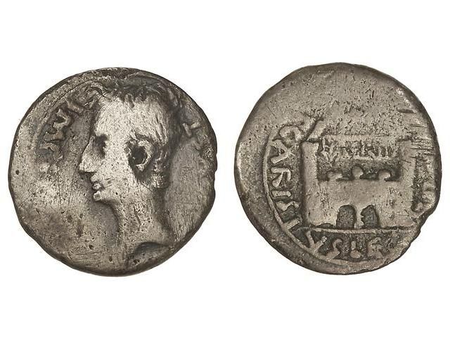 Denario. Acuñada el 25-23 a.C. ÉPOCA DE AUGUSTO. EMERITA AUGUSTA. Anv.: IMP. (CAESAR AVG)VST. Cabeza descubierta de Augusto a izquierda. Rev.: EMERITA P. CARISIVS LEG. (PRO. PR.). Puerta de la ciudad. 3,15 grs. AB-976; C-398; Cal-396; FFC-249. BC+.