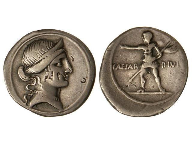Denario. - Acuñada el 32-39 a.C. - AUGUSTO. - Anv.: Cabeza diademado de Venus a derecha. Rev.: Augusto a izquierda, en su mano lanza, en el campo CAESAR DIVI F. 3,80 grs. (Marca de cambista en anverso). C-70; Cal-675; FFC-52. MBC/MBC-. - -