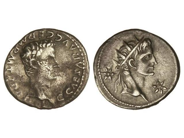 Denario. Acuñada el 37 d.C. CALÍGULA y AUGUSTO. Anv.: C. CAESAR AVG. GERM. P. M. TR. POT. COS. Cabeza descubierta de Calígula a derecha. Rev.: Anepígrafa. Cabeza radiada de Augusto a derecha, entre dos estrellas. 3,60 grs. (Oxidacione