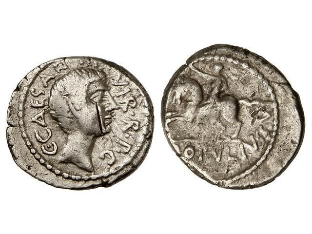 Denario. Acuñada el 41 a.C. AUGUSTO. Anv.: C. CAESAR III VIR. R. P. C. Cabeza descubierta de Augusto a derecha. Rev.: (P)OPVL. IVSSV. Estatua ecuestre de Augusto a izquierda. (Descentrada en reverso. Golpecitos y raya en anverso). MUY ESCASA. C-227; Cal-656; FFC-164. (MBC).