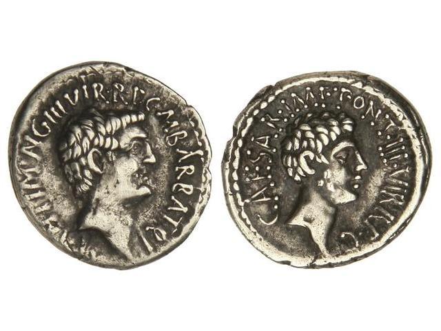 Denario. - Acuñada el 41 a.C. - MARCO ANTONIO y AUGUSTO. - Anv.: M. ANT. IMP. AVG. III VIR. R. P. C. M. BARBAT. Q. P. Cabeza descubierta de Marco Antonio. Rev.: CAESAR IMP. PONT. III VIR. R. P. C. Cabeza descubierta de Augusto a derecha. 3,70 grs. Pátina. (Pequeños golpecitos. Limpiada). C-8. MBC+. - -
