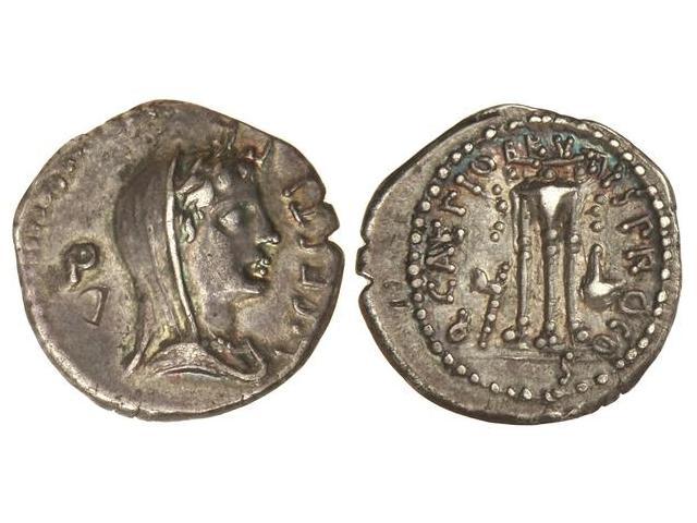 Denario. - Acuñada el 43-42 a.C. - BRUTO. - L. Sestius. - Anv.: Busto velado de Libertad a derecha. L. SESTI. PRO. Q. Rev.: Trípode entre hacha y símpulo. Q. CAEPIO BRVTVS PRO. COS. 3,70 grs. Pátina irisada. (Marca de cambista en anverso). C-11; Cal-877; FFC-9. MBC+. - -