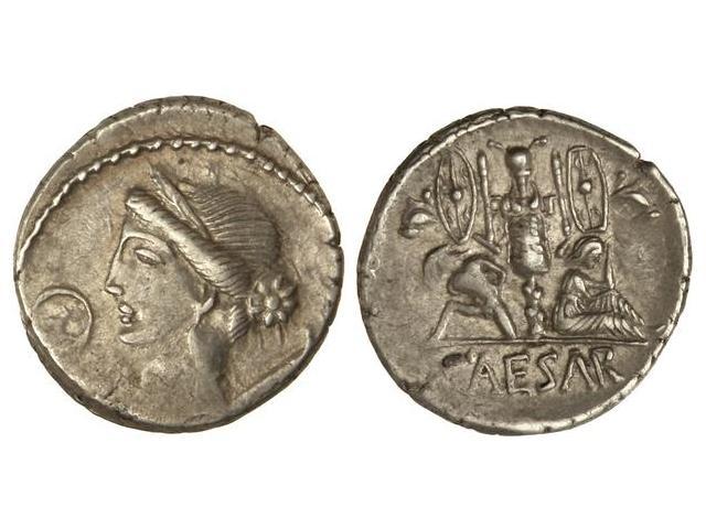 Denario. - Acuñada el 44 a.C. - JULIO CÉSAR. - Anv.: Cabeza diademada de Venus a izquierda, delante Cupido y lítuo, detrás cetro. Rev.: Trofeo en medio Vercingetorix cautivo a izquierda y Galia a derecha. En exergo: CAESAR. 3,80 grs. (Acuñación parcialmente floja). C-14; Cal-646, FFC-12. MBC+. - -