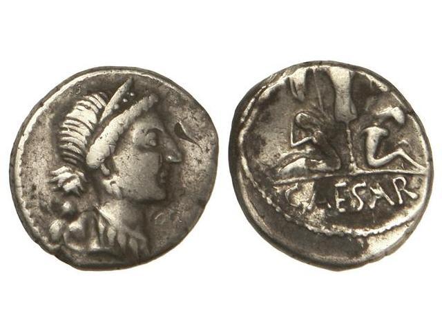 Denario. Acuñada el 48 a.C. JULIO CÉSAR. Anv.: Cabeza de Venus con diadema a derecha, Cupido detrás. Rev.: CAESAR. Trofeo con dos escudos y dos trompetas galas, cautivo y mujer. 3,80 grs. (Oxidación en reverso. Golpe en anverso). C-13; Cal-646; FFC-12. MBC-.