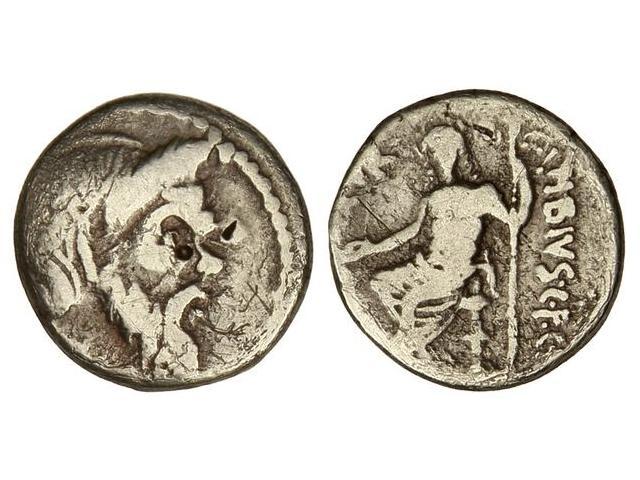 Denario. Acuñada el 48 a.C. VIBIA-18. C. Vibius C. f. C. n. Pansa. Anv.: Máscara de Pan a derecha, leyenda debajo no visible. 3,60 grs. (Algo recortada. Dos golpes, uno ¿posible marca de cambista?). Cal-1371; FFC-Tipo 1219. MBC-/BC+.