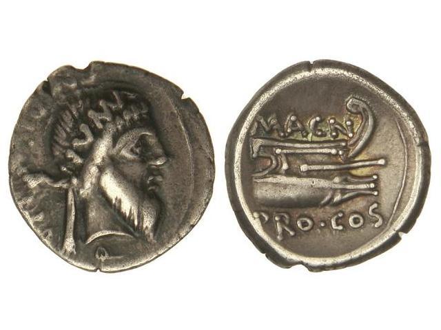 Denario. - Acuñada el 49 a.C. - POMPEYO MAGNO. - HISPANIA. - Cn. Calpurnius Piso. - Anv.: Cabeza de Numa a derecha, en diadema NUMA, detrás (CN. PISO. PRO. Q.). Rev.: Proa de nave a derecha, encima MAGN. debajo PRO. COS. 4,20 gs. Pátina. C-4; Cal-373; FFC-6. MBC/MBC+. - -