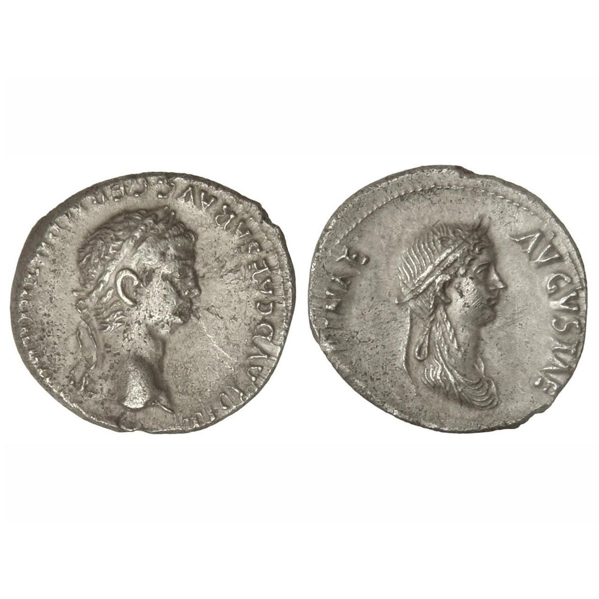 Denario. - Acuñada el 51-54 d.C. - CLAUDIO Y AGRIPINA HIJA. - Anv.: TI. CLAVD. CAESAR AVG. GERM. P. M. TRIB. POT. P. P. Cabeza laureada de Claudio a derecha. Rev.: (AGRI)PPINAE AVGVSTAE. Busto revestido de Agripina a derecha, con corona de espigas. 3,58 grs. (Algunas rayitas y oxidaciones). RARA. C-4. MBC+/EBC-. - -