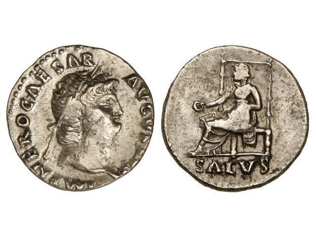 Denario. Acuñada el 63-68 d.C. NERÓN. Anv.: IMP. NERO CAESAR AVG. P. P. Busto a derecha. Rev.: Salud sedente portando pátera. 3,20 grs. RARO. C-316. EBC-/MBC.