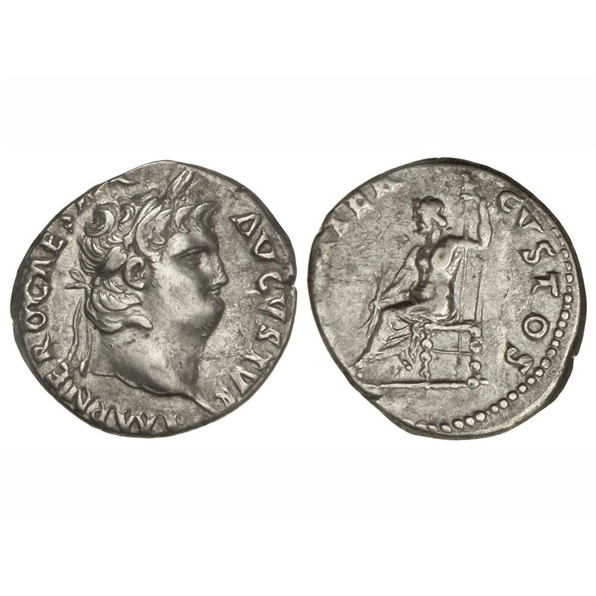 Denario. - Acuñada el 63-68 d.C. - NERÓN. - Anv.: IMP. NERO CAESAR AVGVSTVS. Busto laureado a derecha. Rev.: (IVP)PITER CVSTOS. Júpiter sentado a izquierda. 3,25 grs. C-119. MBC+/MBC. - -