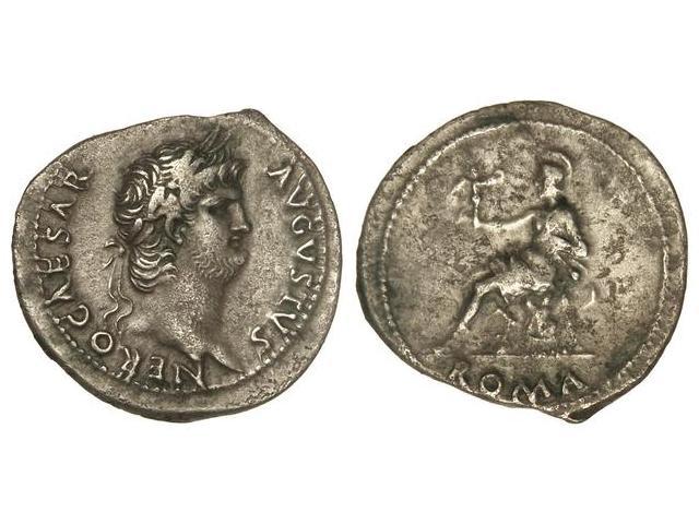 Denario. - Acuñada el 63-68 d.C. - NERÓN. - Anv.: NERO CAESAR AVGVSTVS. Cabeza laureada a derecha. Rev.: ROMA. Roma sentada a izquierda con Victoria y parazonio. 3,30 grs. (Leves oxidaciones limpiadas). C-258. (MBC+). - -