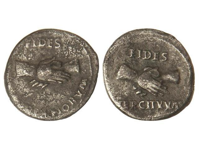Denario. Acuñada el 68-69 d.C. GUERRAS CIVILES. Anv.: FIDES (PRAETO)RIANORVM. Manos enlazadas. Rev.: FIDES (E)XERCITVVM. Manos enlazadas. 3,20 grs. Pátina. (Oxidaciones). C-363. MBC-/MBC.
