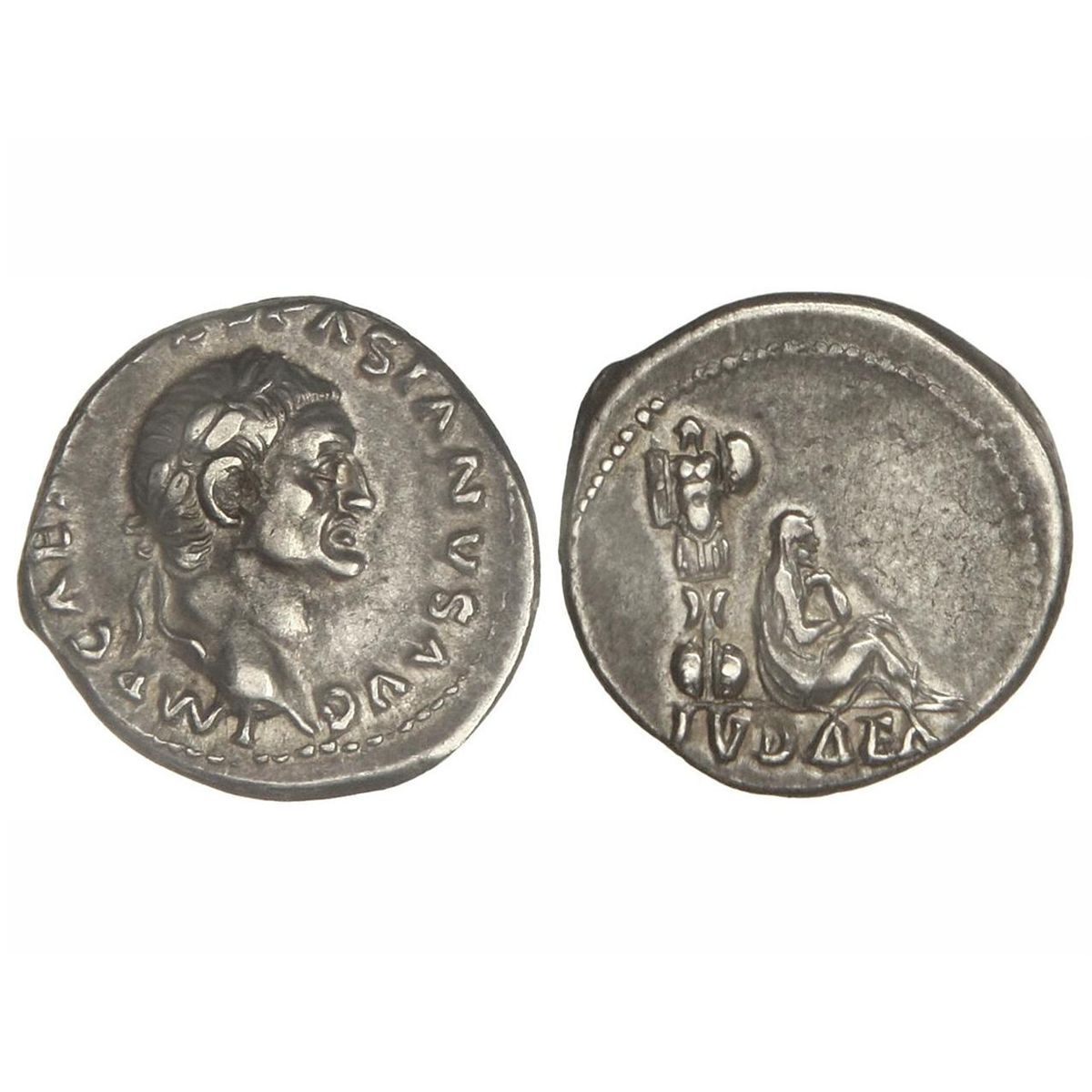 Denario. - Acuñada el 69-70 d.C. - VESPASIANO. - Anv.: IMP. CAES(SAR V)ESPASIANVS AVG. Busto laureado a derecha. Rev.: IVDAEA. Judea sentada a derecha, detrás trofeo. 2,98 grs. MUY ESCASA. C-226. EBC-/MBC+. - -