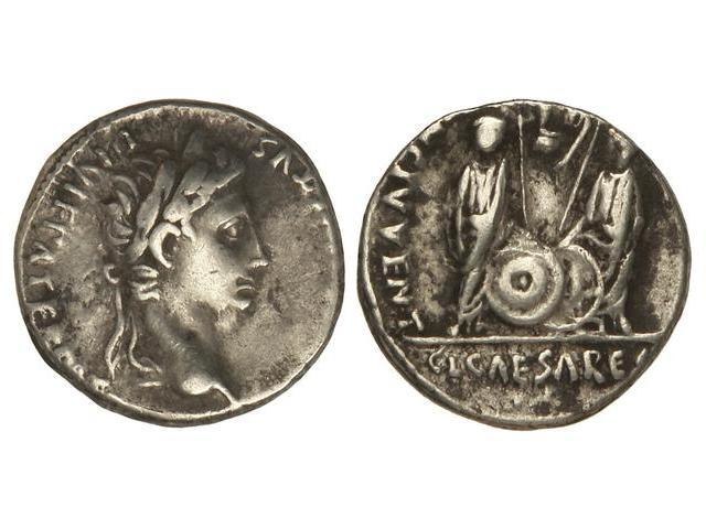 Denario. Acuñada el 7-6 a.C. AUGUSTO. Anv.: (CAESAR AVG)VSTVS DIVI F. PATER PAT... Cabeza laureada de Augusto a derecha. Rev.: C. L. CAESARES C. IVVENT. Cayo y Lucio en pie, en medio dos escudos, encima símpulo y lituo. C-43; Cal-852; FFC-22. MBC-.