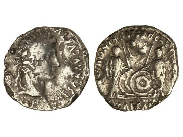 Denario. Acuñada el 7-6 a.C. AUGUSTO. Anv.: CAESAR AVGVSTVS (DIVI. F. PATER PATRIAE). Cabeza laureada de Augusto a derecha. Rev.: C. L. CAESARES AVGVSTI. F. COS. DESIG. PRINC. IVVENT. Cayo y Lucio, en medio dos escudos, encima lituo y símpulo. 3,40 grs. (Golpes y rayitas). C-43c; Cal-855; FFC-25. (BC+).