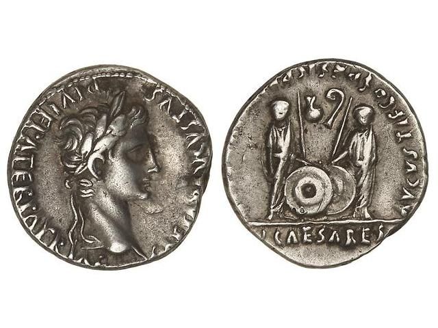 Denario. Acuñada el 7-6 a.C. AUGUSTO. Anv.: CAESAR AVGVSTVS DIVI F. PATER PATRIAE. Cabeza laureada de Augusto a derecha. Rev.: C. L. CAESARES AVGVSTI F. COS. DESIG. (PRINC. IVVENT.). Cayo y Lucio en pie de frente, delante dos escudos, encima símpulo y lituo. 3,80 grs. C-43; Cal-852; FFC-22. MBC+.