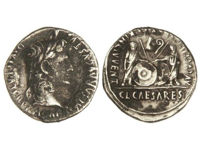 Denario. Acuñada el 7-6 a.C. AUGUSTO. Anv.: CAESAR AVGVSTVS DIVI. F. PATER PATRIAE. Cabeza laureada de Augusto a derecha. Rev.: C. L. CAESARES AVGVSTI. F. COS. DESIG. Pie en medio dos escudos, encima símpulo y lituo. 3,90 grs. AR. (Oxidaciones y concreciones). C-43; Cal-852; FFC-22. BC+/MBC-.
