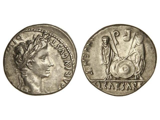 Denario. Acuñada el 7-6 a.c. AUGUSTO. Anv.: (CAES)AR AVGVSTVS DIVI (F. PATER PATRIAE). Cabeza laureada de Augusto a derecha. Rev.: C. L. CAESARES (AVGVSTI F. COS. DESIG.) PRINC. IVVENT. Cayus y Lucius Césares de frente, en medio sendos escudos, encima a izquierda lituo, a derecha símpulo. C-43c. EBC-.