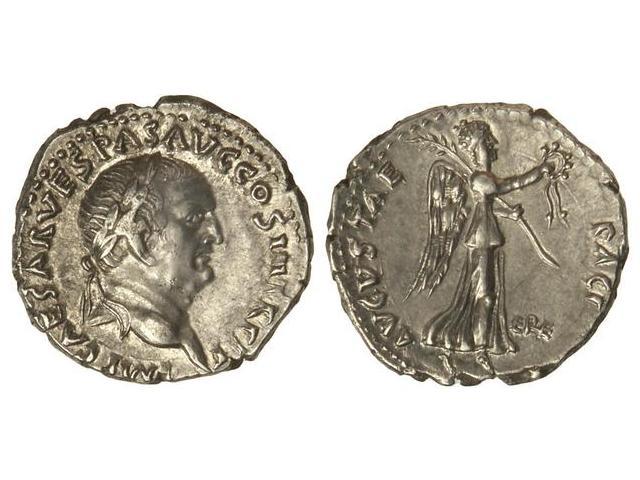 Denario. - Acuñada el 71 d.C. - VESPASIANO. - Anv.: IMP. CAESAR VESPAS AVG. COS. III TR. P. P. P. Cabeza laureada a derecha. Rev.: PACI AVGVSTAE. EPHE en campo. Victoria en marcha a derecha portando palma y guirnalda. 3,50 grs. C-276. MBC+. - -