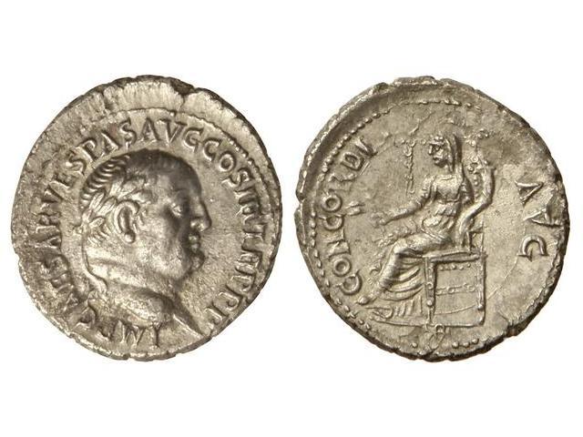 Denario. Acuñada el 71 d.C. VESPASIANO. Anv.: IMP. CAESAR VESPAS. AVG. COS. III TR. P. P. P. Cabeza laureada a derecha. Rev.: CONCORDIA AVG. Ceres sentada a izquierda, portando espigas y cornucopia. En exergo: (EP)HE. 2,62 grs. (Peque