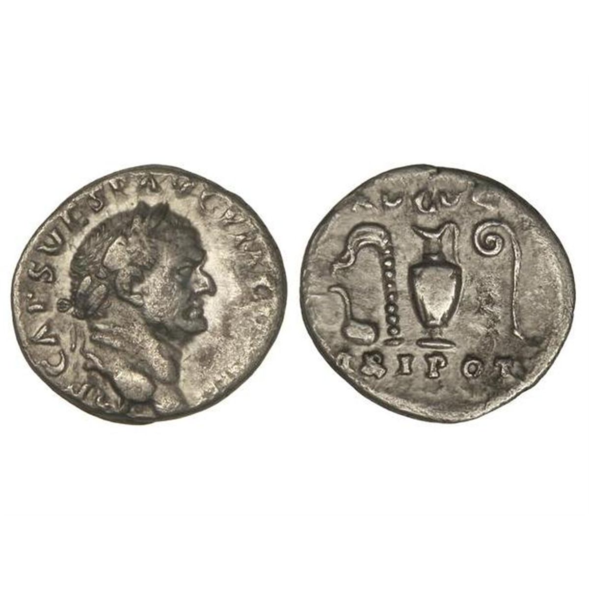 ROMAN COINS: ROMAN EMPIRE - Denario. - Acuñada el 72-73 d.C. - VESPASIANO. - Anv.: IMP. CAES. VESP. AVG. P. M. (COS. IIII). Cabeza laureada a derecha. Rev.: AVGVR TR. I. POT. Símpulo, aspersorio, vaso de sacrificio y bastón de Augur. 2,80 gs. C-45. MBC-/MBC. - -