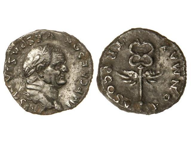 Denario. Acuñada el 74 d.C. VESPASIANO. Anv.: IMP. CAESAR VESPASIANVS AVG. Busto a derecha. Rev.: Caduceo alado. PON. MAX. TR. P. COS. V. 3,20 grs. Pátina. (Pequeñas oxidaciones y leves rayitas en reverso). C-362. MBC+.