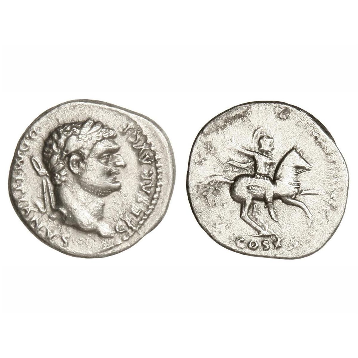 Denario. - Acuñada el 76-80 d.C. - DOMICIANO. - Anv.: CAESAR AVG. F. DOMITIANVS. Busto laureado a derecha. Rev.: COS. V. Hombre a caballo. C-49. MBC+/MBC. - -