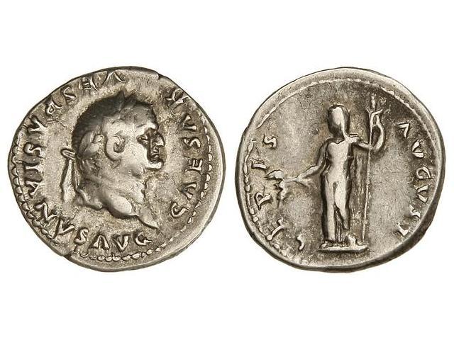 Denario. Acuñada el 77-79 d.C. VESPASIANO. Anv.: CESAR VESPASIANVS AVG. Cabeza laureada a derecha. Rev.: CEREST. AVGVST. Ceres en pie a izquierda con cetro y espigas con amapola. C-54. (MBC+).