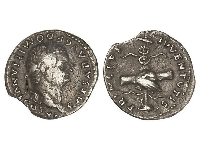 Denario. Acuñada el 79 d.C. DOMICIANO. Anv.: CAESAR AVG. F. DOMITIANVS COS. VI. Cabeza laureada a derecha. Rev.: PRINCEPS IVVENTVTIS. Manos enlazadas con águila legionaria sobre proa de nave. 2,90 grs. (Oxidaciones). C-393. MBC.