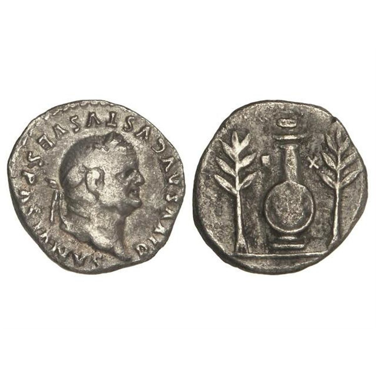 ROMAN COINS: ROMAN EMPIRE - Denario. - Acuñada el 80-81 d.C. - VESPASIANO. - Anv.: DIVVS AVGVSTVS VESPASIANVS. Cabeza laureada a derecha. Rev.: EX (S.C.). Escudo sobre columna rematado por jarra, ramas de laurel a ambos lados. 3 grs. C-149. MBC. - -