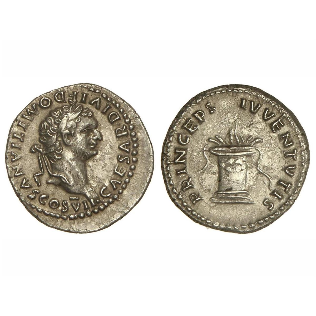 Denario. - Acuñada el 80 d.C. - DOMICIANO. - Anv.: CAESAR DIVI F. DOMITIANVS COS. VII. Cabeza laureada a derecha. Rev.: PRINCEPS IVVENTVTIS. Altar engalanado e iluminado. 3,50 grs. (Algo descentrado en anverso). C-397a. EBC-. - -