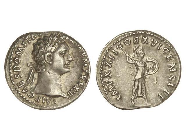 Denario. Acuñada el 92-93 d.C. DOMICIANO. Anv.: IMP. CAES. DOMIT. A(VG. GERM.) P. M. TR. P. XIII. Cabeza laureada a derecha. Rev.: IMP. XXII COS. XVI CENS. P. P. P. Minerva en marcha a derecha blandiendo jabalina. 3,40 grs. AR. C-282.