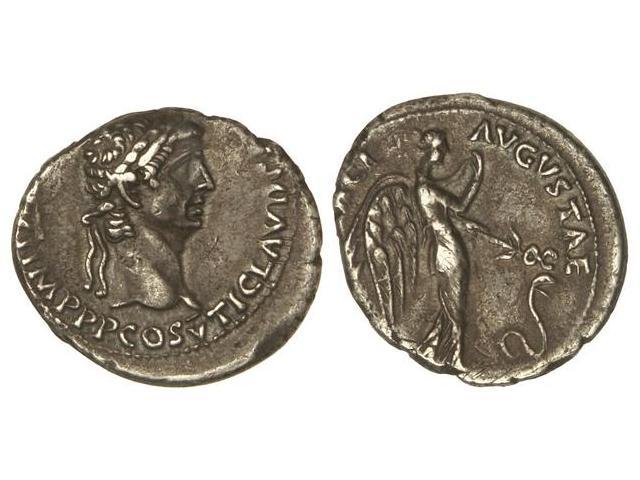 Denario. - Acuñadda el 51-52 d.C. - CLAUDIO. - Anv.: TI. CLAVD. C(AESAR AVG. P. M. TR. P. XI) IMP. P. P. COS. V. Cabeza laureada a derecha. Rev.: (PA)CI AVGVSTAE. Némesis marchando a derecha, precedida por una serpiente. 3,70 grs. AR. Pátina. (Pequeño golpecito y pequeñas rayitas en anverso. Descentrada). C-68. (EBC-)/MBC+. - -