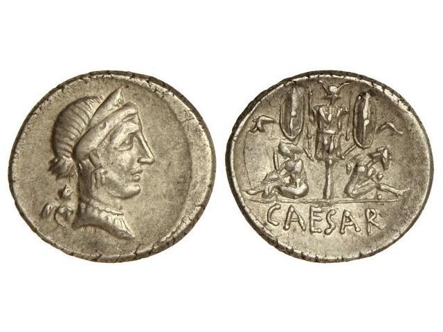 Denario. - Acuñado el 46-45 a.C. - JULIO CÉSAR. - Anv.: Cabeza diademada de Venus a derecha, detrás Cupido. Rev.: Trofeo de armas galas en medio de Galia sentada a izquierda, y Vercingetorix cautivo a derecha. En exergo: CAESAR. 3,90 grs. (Pequeños golpecitos). C-13; Cal-645; FFC-11. MBC+. - -