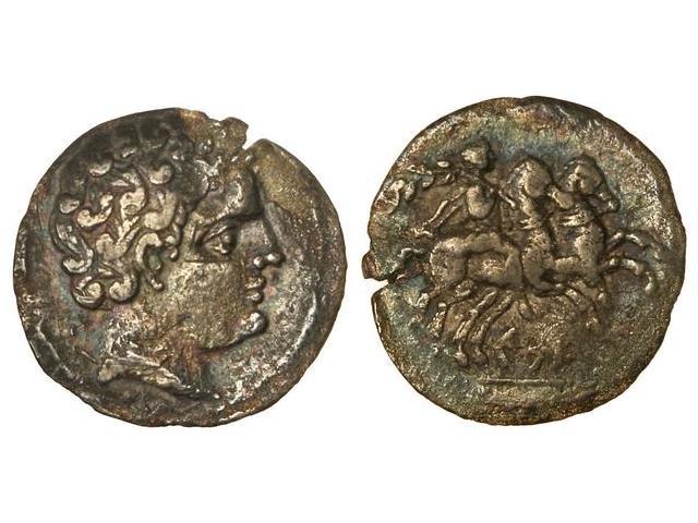 Denario. KESE. Anv.: Cabeza masculina a derecha. Rev.: Jinete a derecha con palma, conduciendo un segundo caballo, debajo sobre línea leyenda ibérica. 3,80 grs. AR. Pátina. (Oxidaciones y grieta). AB-2266. MBC/MBC-.