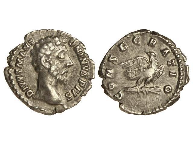 Denario. - MARCO AURELIO. Restitución de CÓMODO. - Anv.: DIVVS M. ANTONINVS PIVS. Cabeza descubierta a derecha. Rev.: CONSECRATIO. Águila a derecha, cabeza vuelta. 2,70 grs. C-78. MBC+/MBC. - -