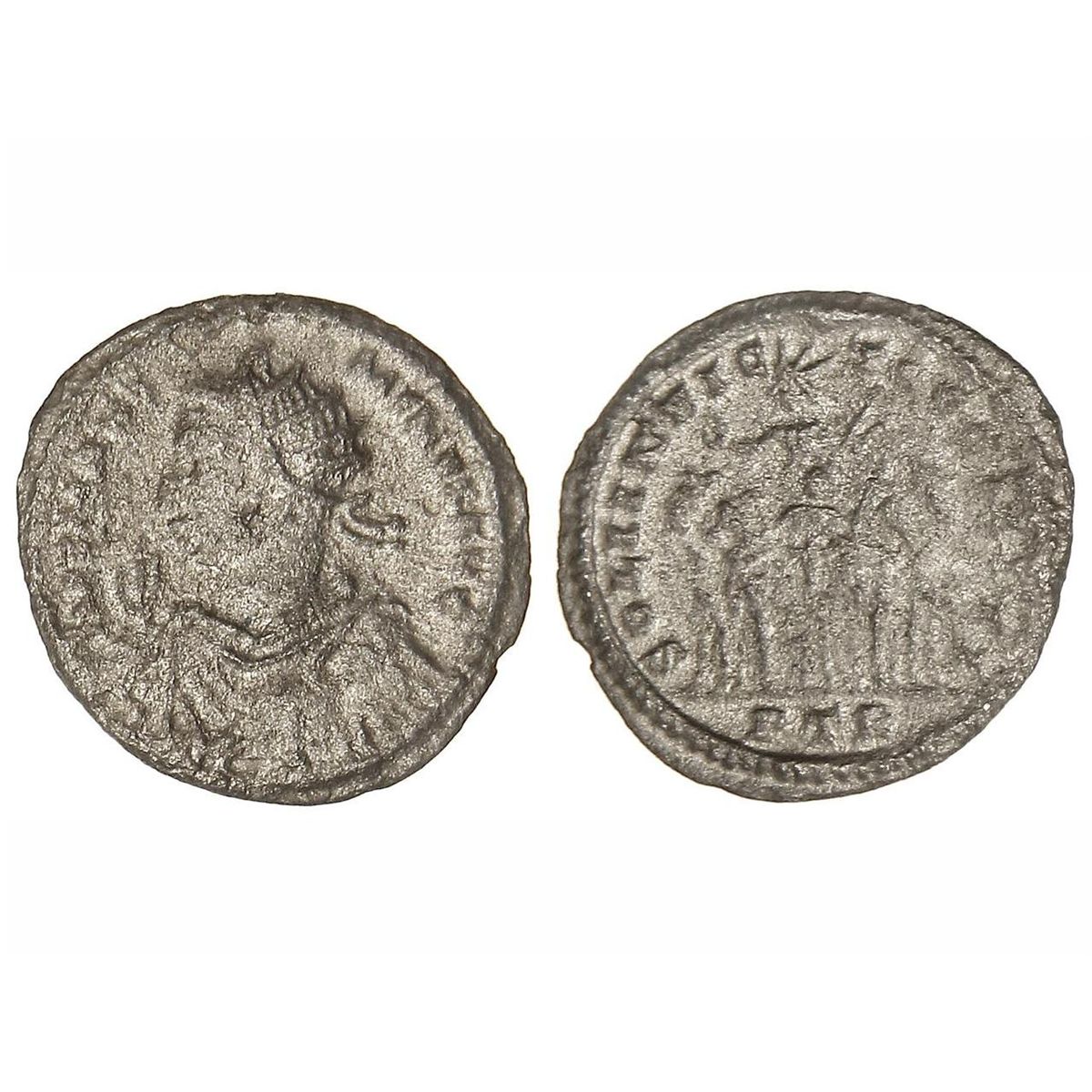 Denario de vellón. - Acuñada el 309-313 d.C. - MAXIMINO DAZA. - Anv.: IMP. MAXIMINVS AVG. Busto coronado con corona radial a izquierda. Rev.: SOLI INVICTO COMITI. PTR. Sol en cuadriga de frente. 2 grs. Ve. C-175. MBC+. - -