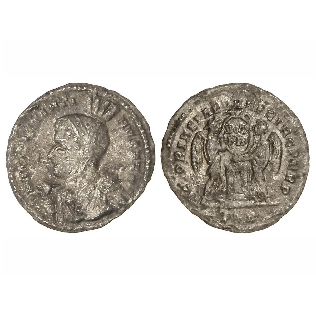 Denario de vellón. - Acuñada el 318-319 d.C. - CONSTANTINO MAGNO. - Anv.: IMP. CONSTANTINVS AVG. Busto con casco adornado a izquierda. Rev.: VICTORIAE LAETAE PRINC. PERP. En exergo: P¶R. Dos Victorias sosteniendo escudo en el que se lee VOT/PR. RARA. C-638. MBC. - -