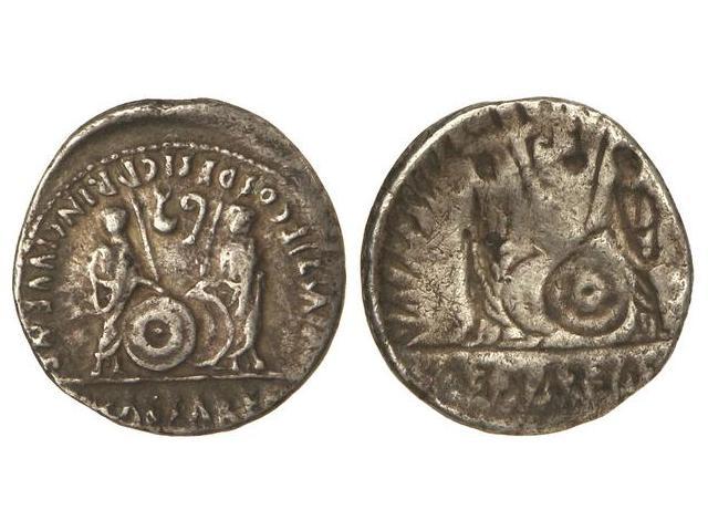 Denario incuso. - Acuñada el 7-6 a.C. - AUGUSTO. - Rev.: C. L.CAESARES AVGVSTI F. COS. DESIG. PRINC. IVVENT. Cayo y Lucio Césares de frente en medio sendos escudos, encima a izquierda símpulo, a derecha lituo. 3,70 grs. Anverso incuso. Pátina. C-43; Cal-852; FFC-22. MBC+. - -