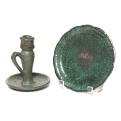 Denby Ware chamberstick, green matt glaze with stylized squeezebag design, marked, 6"h; with a Gustavsberg plate, mottled green glaze with applied silver design of a basket of fruit, marked, 7.5"w