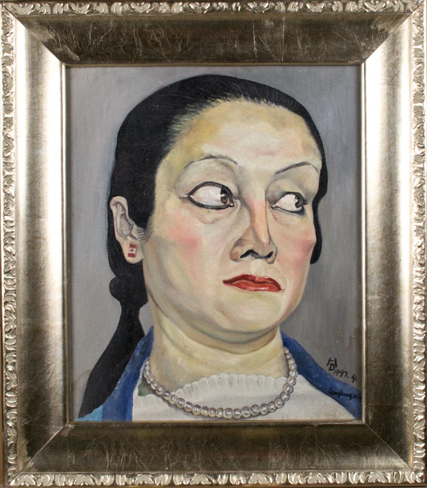 Painted to depict a lady with pearl necklace and pale face signed and dated lower right 1997Deng Hongxia is a Chinese contemporary artist working today, 18"H X 15"W not including the frame.