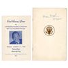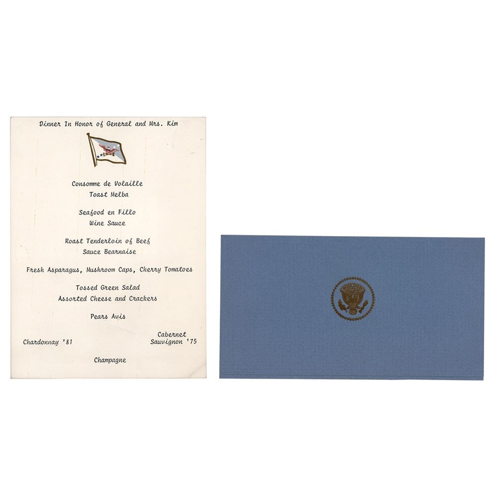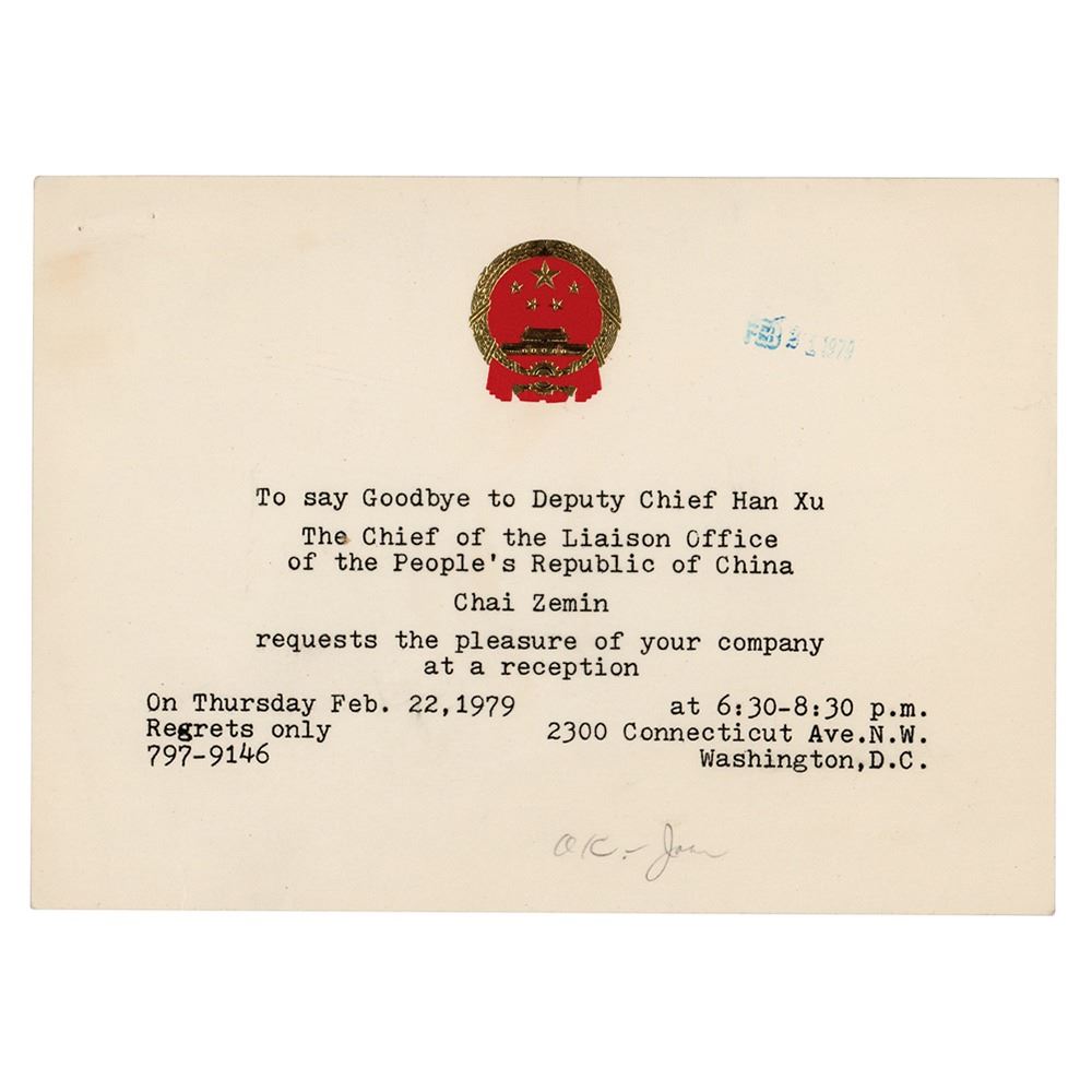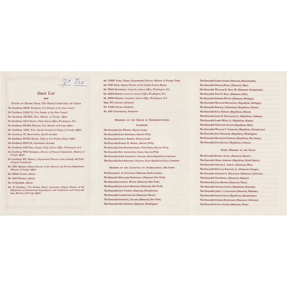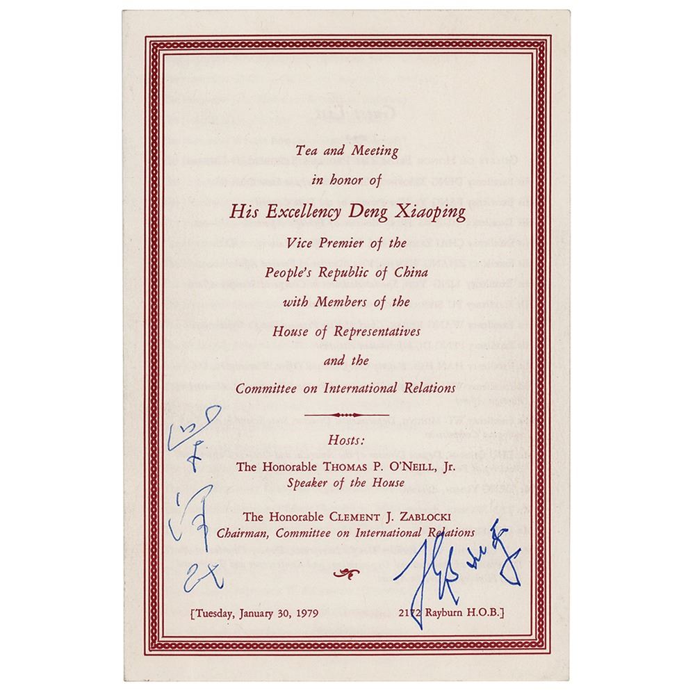 Rare programs for a "Tea and Meeting in honor of His Excellency Deng Xiaoping" with members of the House of Representatives on January 30, 1979, six pages, 5.5 x 8.25, signed on the front in felt tip by Deng Xiaoping and one other. In fine condition. The consignor notes that this was signed for Congressman Samuel S. Stratton of New York, who is listed in the program's guest list. Additionally accompanied by a program for the Performance of American Arts presented in honor of Deng's visit on January 29, 1979; an entrance pass and White House invitation card for the performance; an invitation for a 1979 reception honoring Chai Zemin; a program for a 1980 fundraising dinner for Congressman Stratton's campaign; and an official menu for a dinner honoring "General and Mrs. Kim."
