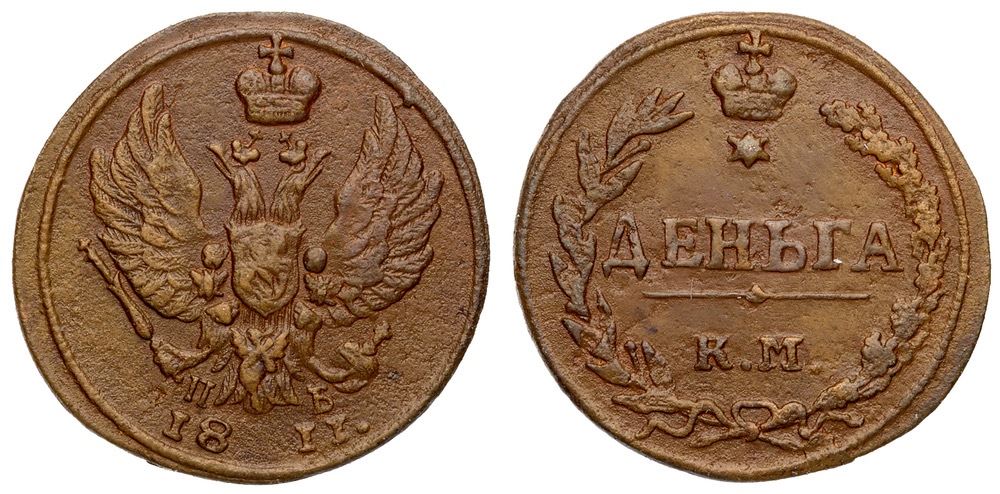 2.96 gm. Eagle’s wings away from rim. Bit 484 (R1), B 154 (R), Petrov (10 Rubl.). Rare. Light surface corrosion. Good Very Fine. Ex “Russian Coins & Medals”, Sincona Auction 58, Zürich, October 21, 2019, lot 321. Comes with auction tag