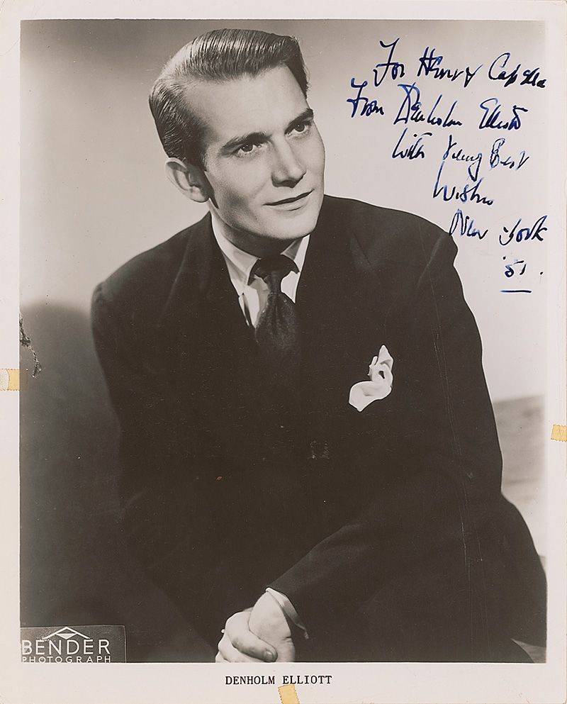 Dashing vintage glossy 8 x 10 photo of a young Elliot, signed and inscribed in fountain pen “For Henry Capelle, From Denholm Elliot, With very best wishes, New York ‘51.” In very good condition, with a noticeable vertical crease to right side, scattered creases and impressions, small tape remnants on three edges, and some irregular ink adhesion to signature and inscription.
