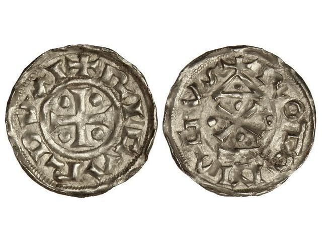 Denier. - (943-996). - RICARDO I, DUQUE DE NORMANDÍA. - Anv.: ¶RICARDVS I. Cruz con puntos en espacios. Rev.: ROTOMAGVS. Templo. 1,20 grs. AR. Poey-113 var. MBC+. - -