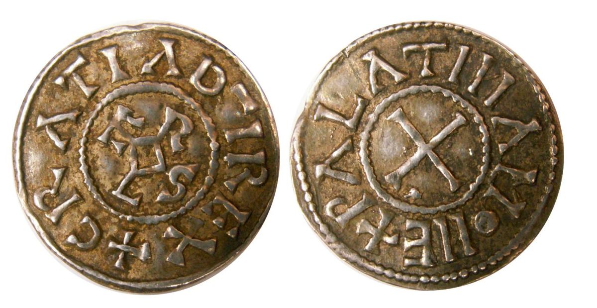 Denier du Palais; Charles the bald, Obv: +CAROLVS REX, central cross with four besants. Rev: PALATINA MONET, central monogram. Palace mint.