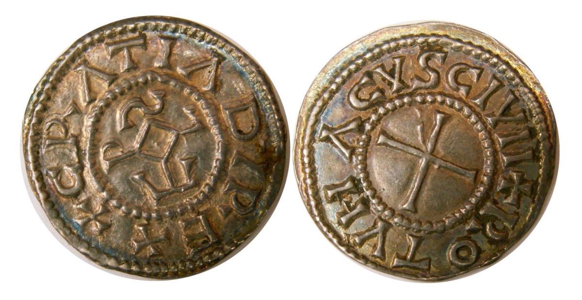 Denier du Rouen; Obv: +CRATIA D-I REX, central KRLS monogram. Rev: +ROTVMACVS CIVII, central cross.