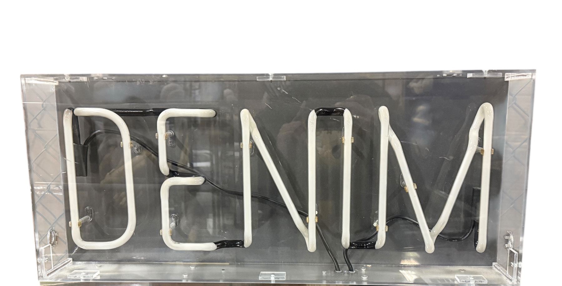 Denim - White Neon Sign - working condition - approx 27 1/2" x 15" (From Hudson's Bay)