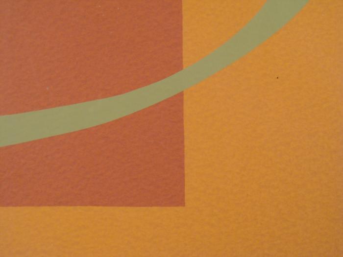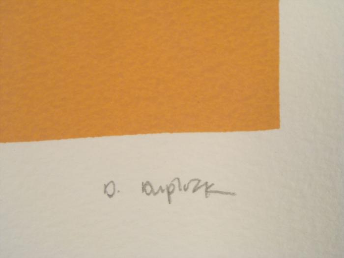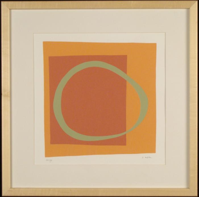 This modern art print presents simple, minimalist shapes and colors in its own unique balance. Aritst: Denise Duplock Title: OmegaSignature: In pencil, lower rightMedium: Serigraph on paperImage size: 11 1/8 inches squareFraming: Matted in white, in blonde tone natural wood frameFrame size: 19 1/4 inches squareCondition: Excellent; sticker residue on the glass can be cleaned off This fine print will add a touch of attractive modernism to any wall.